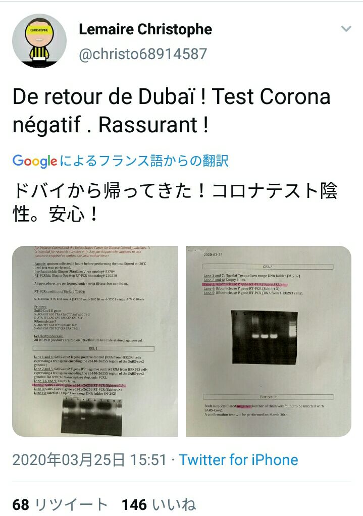 フランス語で「ドバイから戻りました。新型コロナウイルス検査は陰性。安心」と投稿した。