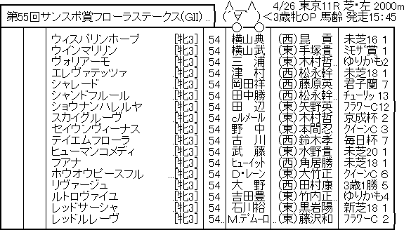 そこそこ流れて速い時計で決着すると、疲労度高くてローテ的にはキツい。スローでヨーイドンだと疲労度は低いが、本番のオークスで対応できない。つまり、ここに出てくる馬はオークスではヒモで抑える程度。デアリングタクトがダービー行けば話は別だが