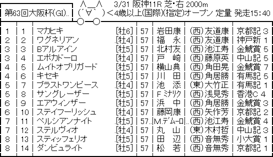 【競馬予想】[3]第63回 大阪杯(G1) /2019 競馬 Twitter Facebook はてブ Pocket LINE コピー 2019.03.30 1: 名無しさん@実況で競馬板アウト 2019/03/30(土) 15:12:48.06 ID:LP58ZFhq0 http://jra.jp/keiba/thisweek/2019/0331_1/syutsuba.html 続きを読む Source: うまなみニュース速報