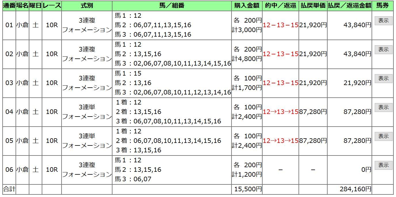 ~小倉10R かささぎ賞 結果1着 ◎12ラミエル(2人気)2着 ○13グッドレイズ(3人気)3着 ☆15ブルベアオーロ…穴推奨(15人気)3連複 12-13-15 21,920円3連単 12-13-15 87,280円