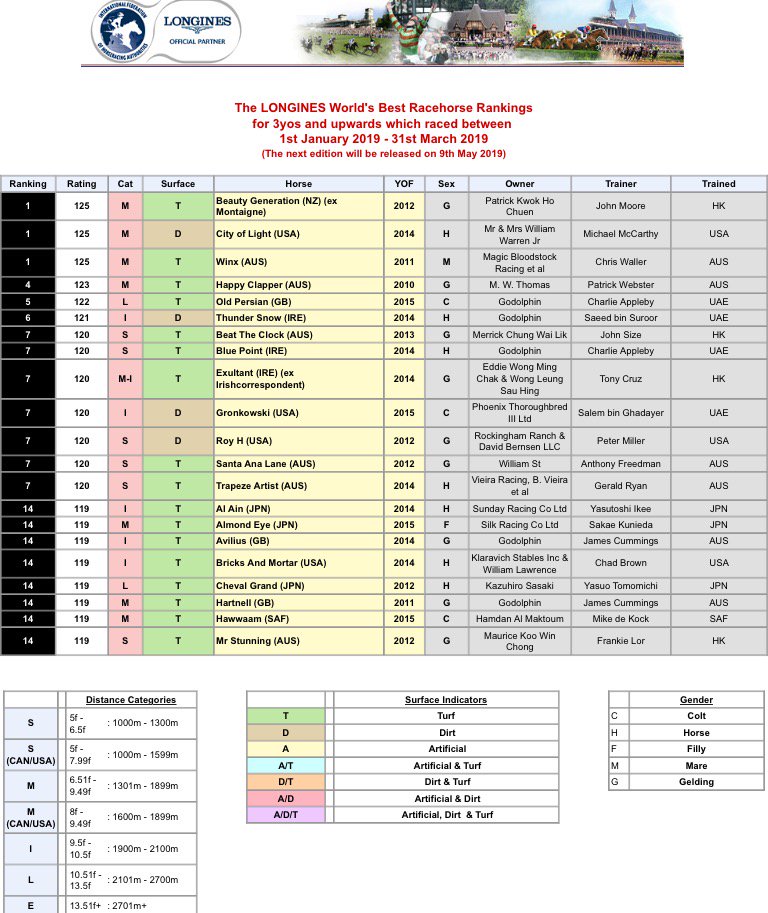 最新のロンジンワールドベストレースホースランキングが発表されました。日本馬の最高位はアーモンドアイ、アルアイン、シュヴァルグランの3頭。119ポンドで14位タイにランクされています https://t.co/8muZ7gseD8