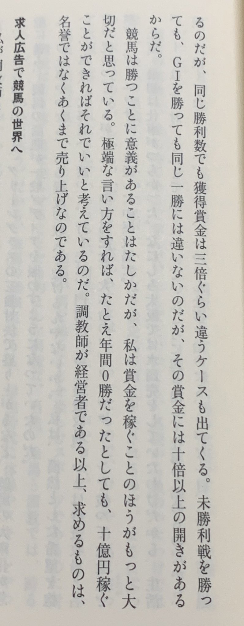 競馬は勝つことに意義があることはたしかだが、私は賞金を稼ぐことのほうがもっと大切だと思っている。極端な言い方をすれば、たとえ年間0勝だったとしても、十億円稼ぐことができればそれでいいと考えているのだ。調教師が経営者である以上、求めるものは、名誉ではなくあくまで売り上げなのである。