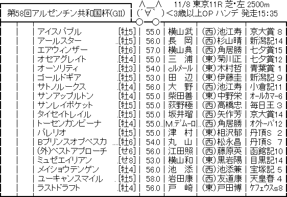 【競馬予想】[1]第58回 アルゼンチン共和国杯(G2)/2020 競馬 Twitter Facebook はてブ Pocket LINE コピー 2020.11.05 181: 名無しさん@実況で競馬板アウト 2020/11/05(木) 16:15:27.47 ID:AAMztyUn0 続きを読む Source: うまなみニュース速報