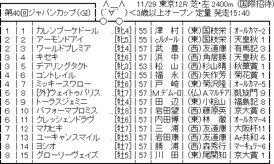 【枠順確定】第40回ジャパンカップ(G1)/アーモンドアイは2枠2番、コントレイルは4枠6番、デアリングタクトは3枠5番 競馬 Twitter Facebook はてブ Pocket LINE コピー 2020.11.26 402: 名無しさん@実況で競馬板アウト 2020/11/26(木) 14:12:45.33 ID:KqLrRAgu0 https://jra.jp/keiba/thisweek/2020/1129_1/syutsuba.html 続きを読む Source: うまなみニュース速報