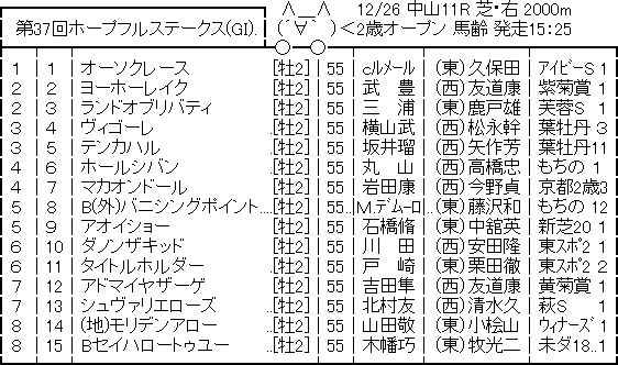 【競馬予想】[2]第37回 ホープフルステークス(GI) / 2020 競馬 Twitter Facebook はてブ Pocket LINE コピー 2020.12.25 720: 名無しさん@実況で競馬板アウト 2020/12/24(木) 14:29:48.22 ID:R1TY+VyB0EVE 枠https://jra.jp/keiba/thisweek/2020/1226_2/syutsuba.html 続きを読む Source: うまなみニュース速報