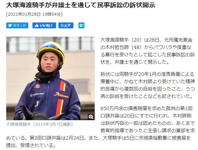 大塚海渡騎手(20)は28日、元所属先厩舎の木村哲也師(48)からパワハラや度重なる暴行を受けたとして起こした民事訴訟の訴状を、弁護士を通じて開示した。