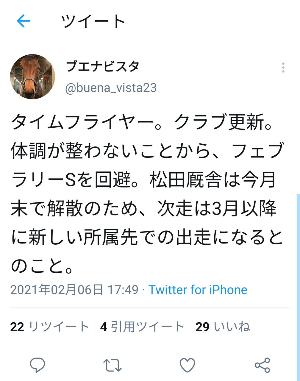 タイムフライヤーがフェブラリーSを回避 競馬 Twitter Facebook はてブ Pocket LINE コピー 2021.02.07 1: 名無しさん@実況で競馬板アウト 2021/02/06(土) 18:11:48.92 ID:1ZSja0UR0 続きを読む Source: うまなみニュース速報
