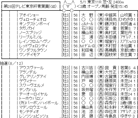 【競馬予想】[1]第28回青葉賞(G2) /2021 競馬 Twitter Facebook はてブ Pocket LINE コピー 2021.04.28 88: 名無しさん@実況で競馬板アウト 2021/04/25(日) 21:45:08.36 ID:Pv26WfIn0 続きを読む Source: うまなみニュース速報