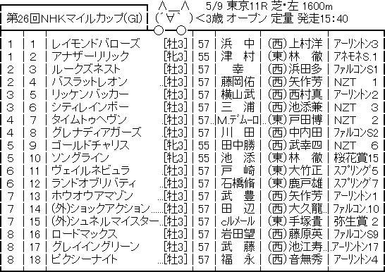 【枠順確定】第26回NHKマイルカップ(G1)/グレナディアガーズ4枠8番、バスラットレオン2枠4番 競馬 Twitter Facebook はてブ Pocket LINE コピー 2021.05.07 302: 名無しさん@実況で競馬板アウト 2021/05/07(金) 09:07:40.16 ID:7I44dwMr0 https://jra.jp/keiba/thisweek/2021/0509_1/syutsuba.html 続きを読む Source: うまなみニュース速報