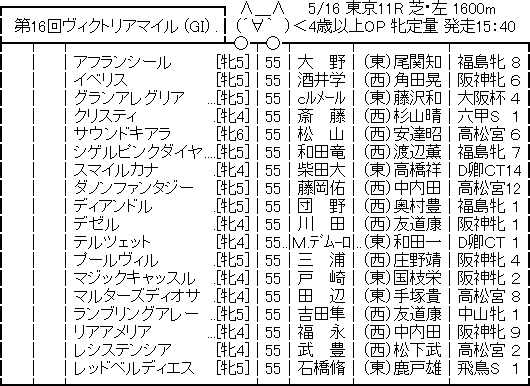 【競馬予想】[2]第16回ヴィクトリアマイル(G1) /2021 競馬 Twitter Facebook はてブ Pocket LINE コピー 2021.05.13 146: 名無しさん@実況で競馬板アウト 2021/05/13(木) 14:31:08.27 ID:AAKCmp5L0 https://jra.jp/keiba/thisweek/2021/0516_1/syutsuba.html 続きを読む Source: うまなみニュース速報