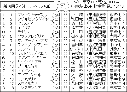 【競馬予想】[3]第16回ヴィクトリアマイル(G1) /2021 競馬 Twitter Facebook はてブ Pocket LINE コピー 2021.05.15 1: 名無しさん@実況で競馬板アウト 2021/05/15(土) 15:21:32.35 ID:/vbQtU1n0 https://jra.jp/keiba/thisweek/2021/0516_1/syutsuba.html 続きを読む Source: うまなみニュース速報