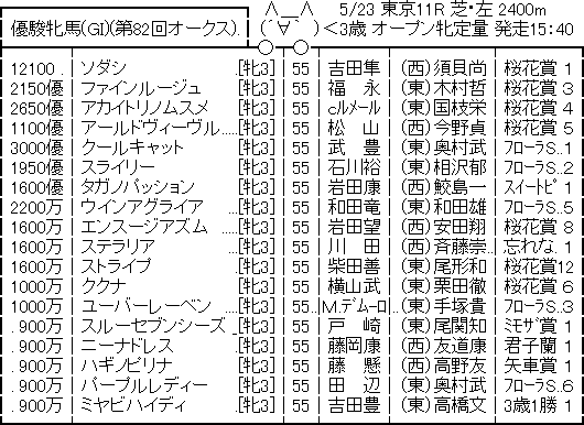 【競馬予想】[1]第82回 オークス(優駿牝馬)(G1) /2021 競馬 Twitter Facebook はてブ Pocket LINE コピー 2021.05.18 1: 2021/05/18(火) 12:55:54.85 続きを読む Source: うまなみニュース速報