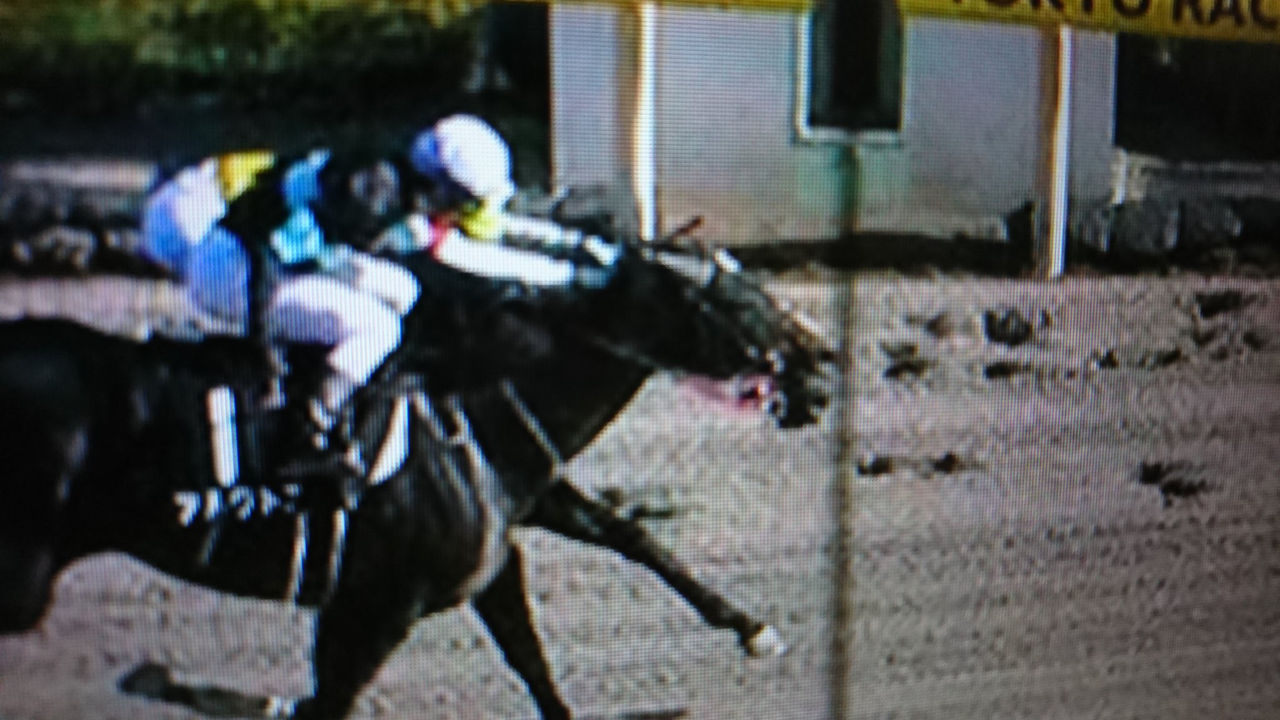 たぶん内の馬の鼻面とダートの影を誤認してると思う