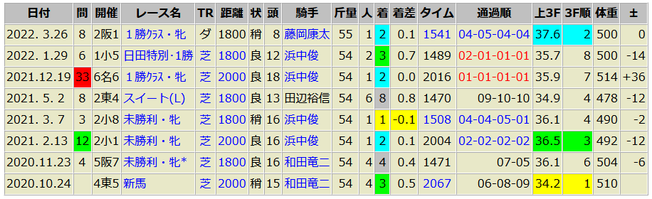 デビューから芝で4戦目に未勝利勝ち。スイートピーSにも出走(8着)。