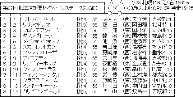 これはリリックドラマ、ウインファビラス、エイシンティンクル、ミッキーチャームの先行勢4頭で決まるよ、函館記念と一緒