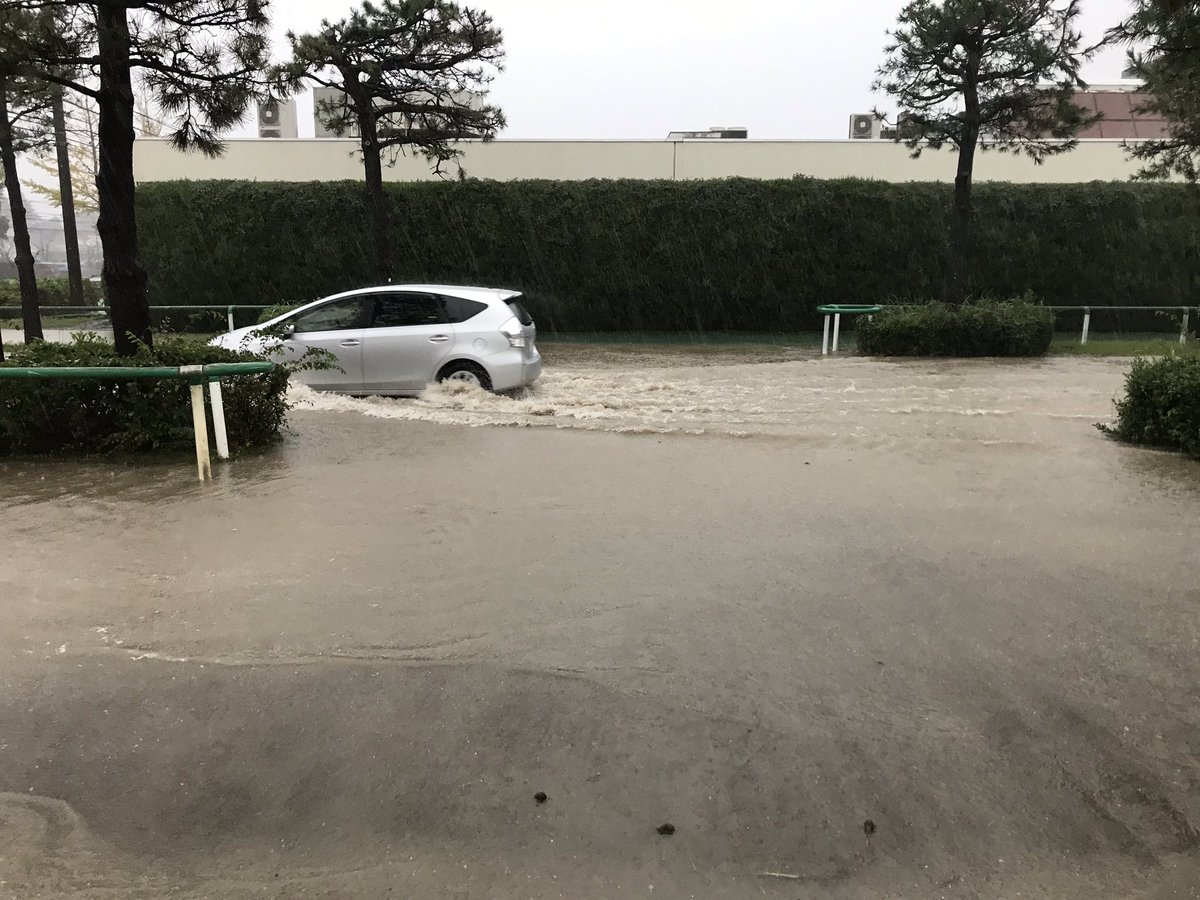 美浦トレセン入口の一部道路も冠水してしまいました。雨強すぎ。こりゃ困った。#豪雨 pic.twitter.com/FHSnnDjC10