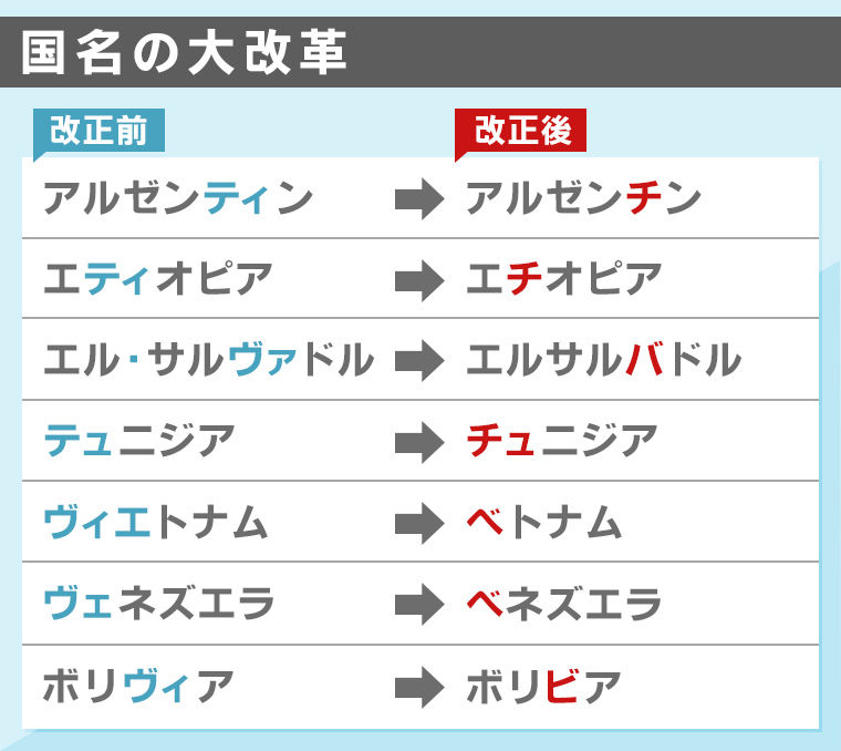 といっても国名の話だ。 「セントクリストファー・ネー『ヴ』ィス」というカリブ海の国の名前が「セントクリストファー・ネービス」に、 そして「カーボ『ヴ』ェルデ」というアフリカにある島国が「カーボベルデ」に変わる。 これで日本語の国名からは『ヴ』がなくなるのだという。 なぜ変わるのか、そもそも外国の日本語名ってどうやって決めているのか。 そんな外国にまつわる日本語の不思議を探ってみた。