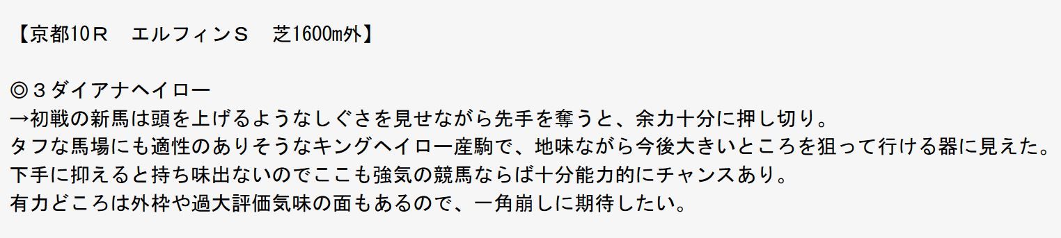 勝ったのは、同じ追い込みのキングヘイロー。大外からグイグイ伸びてきましたよね。産駒も結構好きで、ローレルゲレイロは初期のころ朝日杯やスプリンターズSで本命にしましたし、最近だとダイアナへイローは好きな馬でした。新馬戦が強くてね。次のエルフィンSは自信の本命で勝負レースにしたんだっけな。